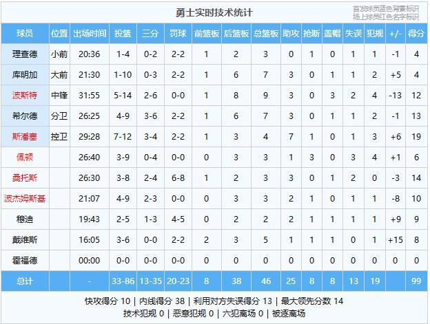 斯潘塞19分4板7助、桑托斯14分3板3助、希尔德13分7板3助、波斯特12分9板3助3帽、波杰姆斯基10分3板2助、穆迪9分2板2助、戴维斯8分5板1助、佩顿6分3板1助3断、库明加4分7板3助、理查德4分3板